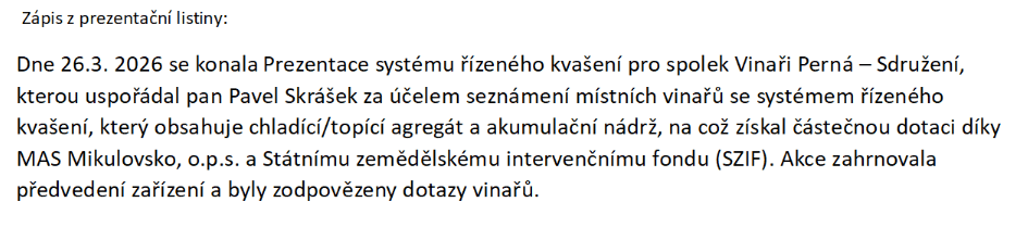 Díky podpoře od Místní akční skupina Mikulovsko o.p.s. se nám podařilo pořídit nový systém řízeného kvašení, který nám umožní posunout kvalitu našich vín zase o úroveň výš.